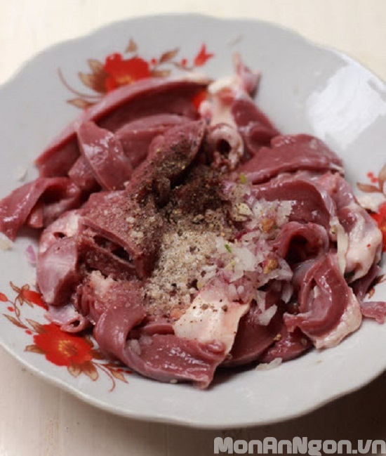 Bước 2: Đem ướp tim heo với hạt nêm, muối , tiêu, nước cốt chanh , trộn đều và ướp khoảng 15 phút cho ngấm gia vị.