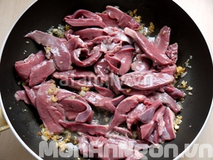 Bước 3: Đun nóng dầu ăn, cho tỏi và hành khô vào phi thơm, cho tim vào đảo đều cùng.